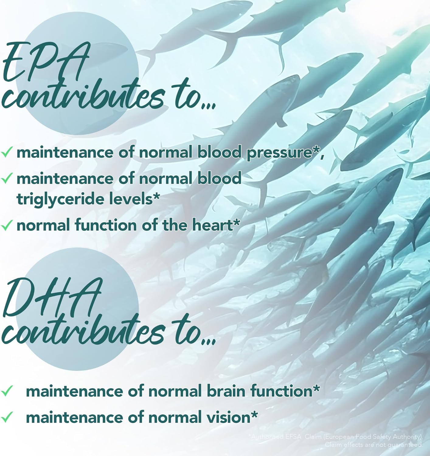 DHA and EPA contribute to the maintenance of normal blood pressure**, normal blood triglyceride levels** and to the normal function of the heart**.