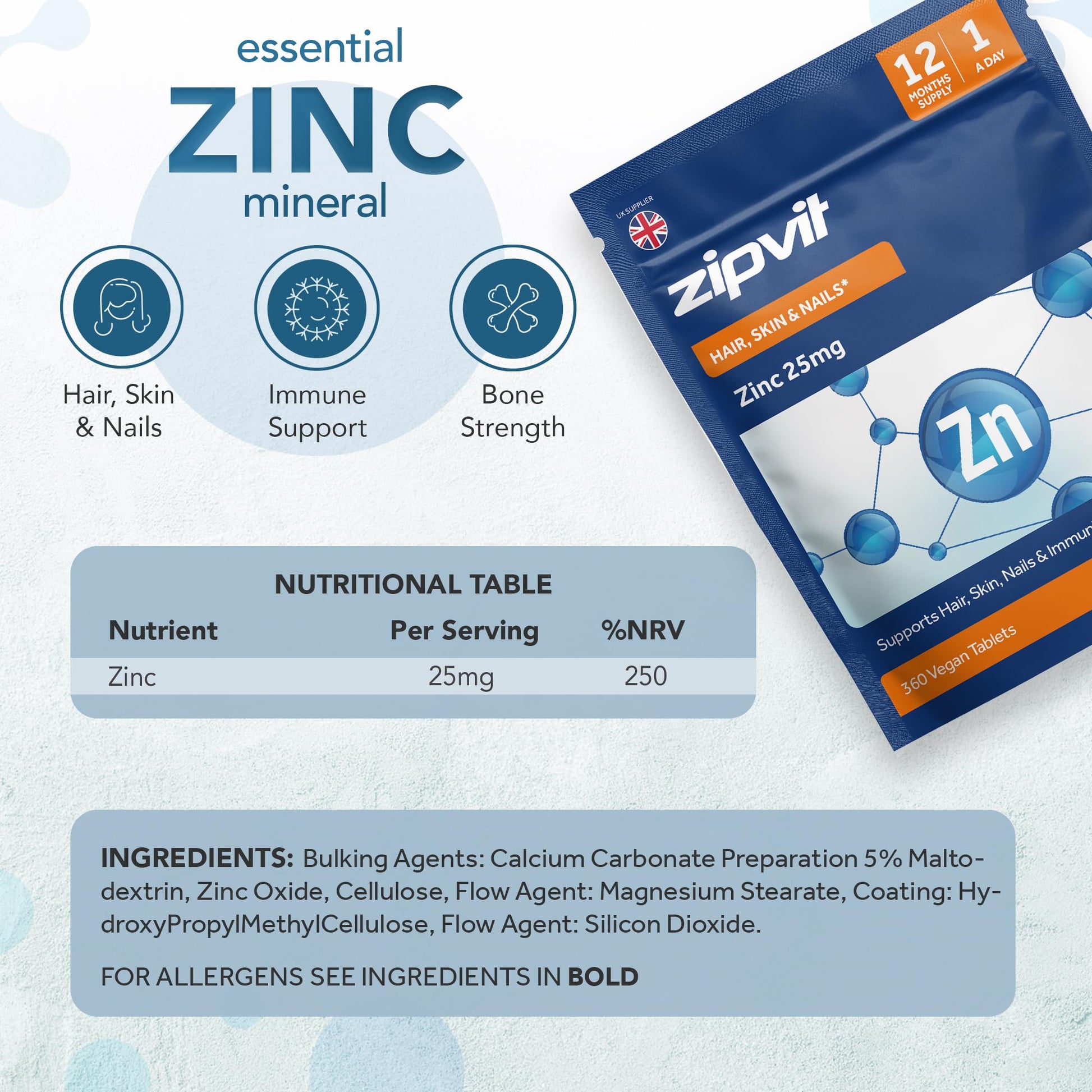 Zipvit Zinc 25mg Pouch, 12 Months Supply, Recommended Dose Zinc Supplement, Supports Hair, Skin, Nails, Bones & Vision, Promotes Immunity, Fertility & Reproduction for Men & Women, 360 Vegan Tablets