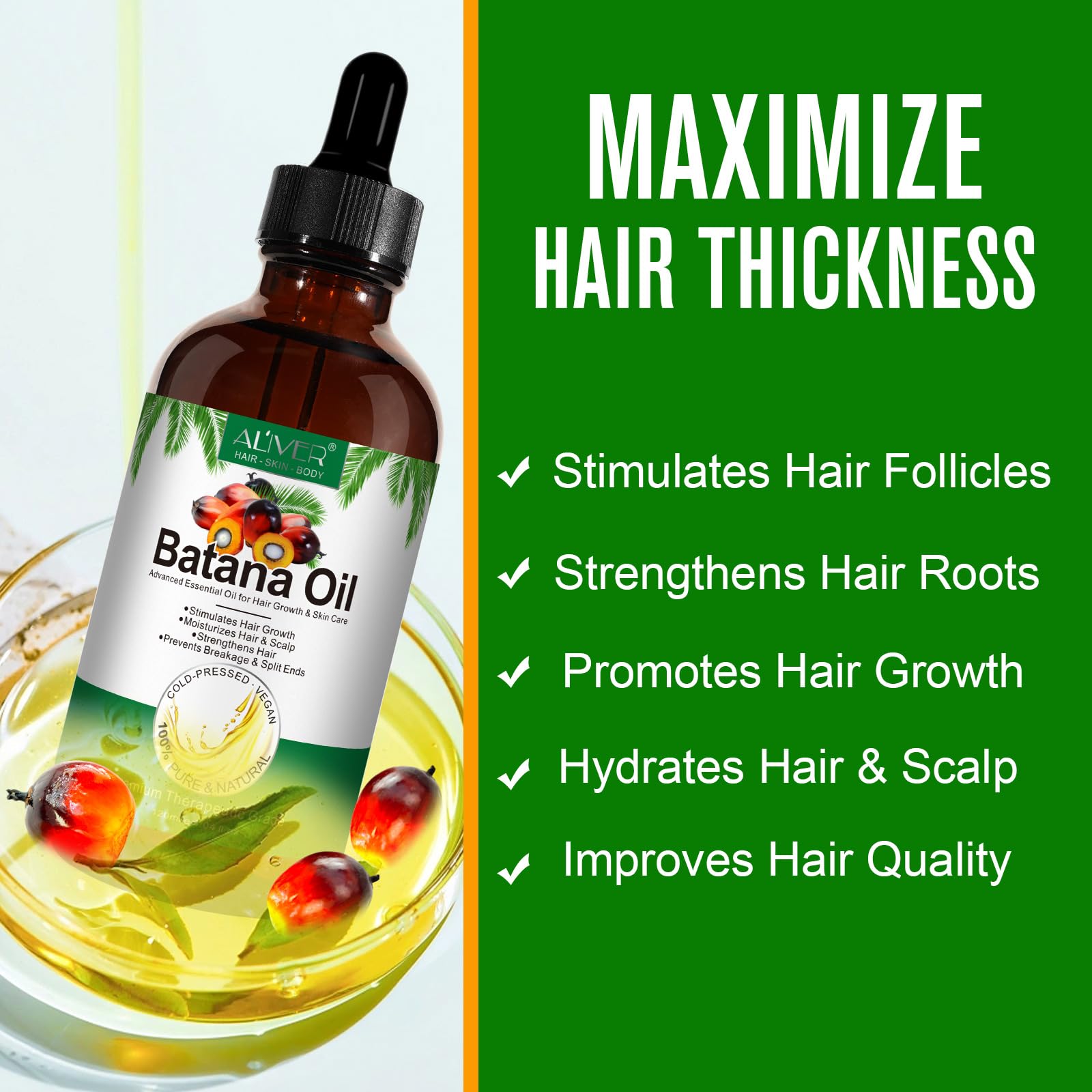 Take about 5 drops of Batana oil and massage evenly into your scalp after bath or shower. Mix with a carrier oil (like jojoba oil or coconut oil). Rinsing out the oil afterward is optional — though if you do rinse, first let the oil sit on your scalp for at least 5 to 10 minutes beforehand.